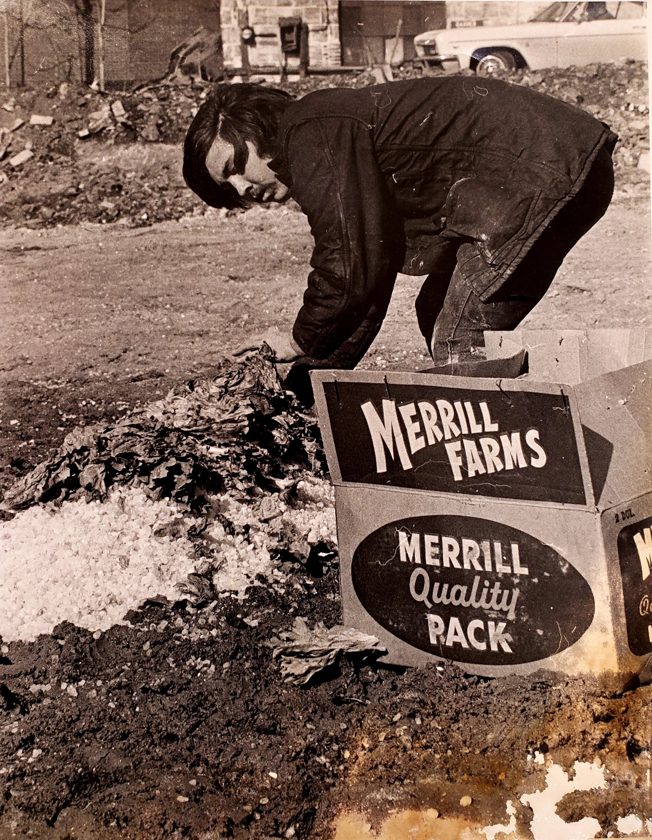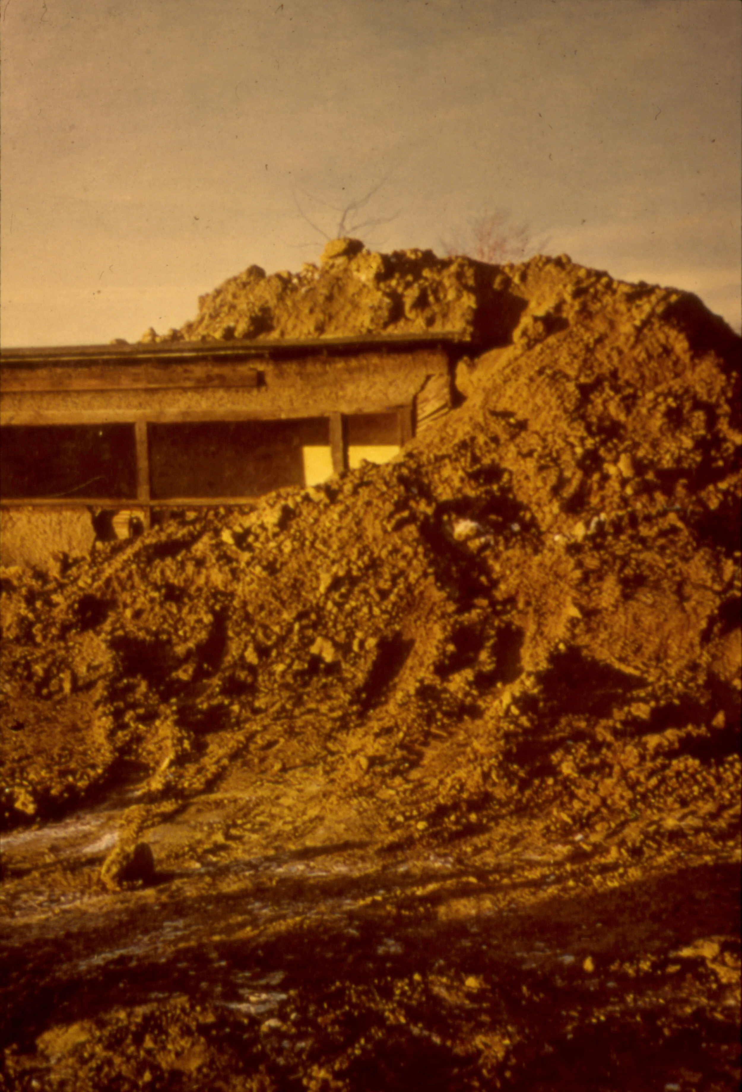 Unlike his other earthworks, this impromptu project began without the prearranged plans in place for a long-term project. Smithson’s original plans for his stay at Kent State as a visiting artist was to conduct a liquid mud pour, continuing his investigation of the nature of time and entropy as explored in his other “flows” such as Asphalt Rundown. However, the inhospitable cold of Ohio’s Januarys hindered any possibility for a viscous mud. With continued prodding by students, Smithson’s contingency plan was to “bury a building.”[1] The project evolved swiftly, propelled in part by motivated student collaborators who, by 9:00 a.m. the following morning, had procured a building, a backhoe, and truckloads of dirt already excavated from a campus building project. The building the students had arranged, an old woodshed, was one of the existing buildings standing on farmland recently acquired by the university, all of which were slated for demolition in preparation for new campus construction. Consequently, the students request to use the woodshed for Smithson’s project was approved by the University as the building were all intended to be razed, and thus the collapse of the woodshed would be inconsequential.[2]