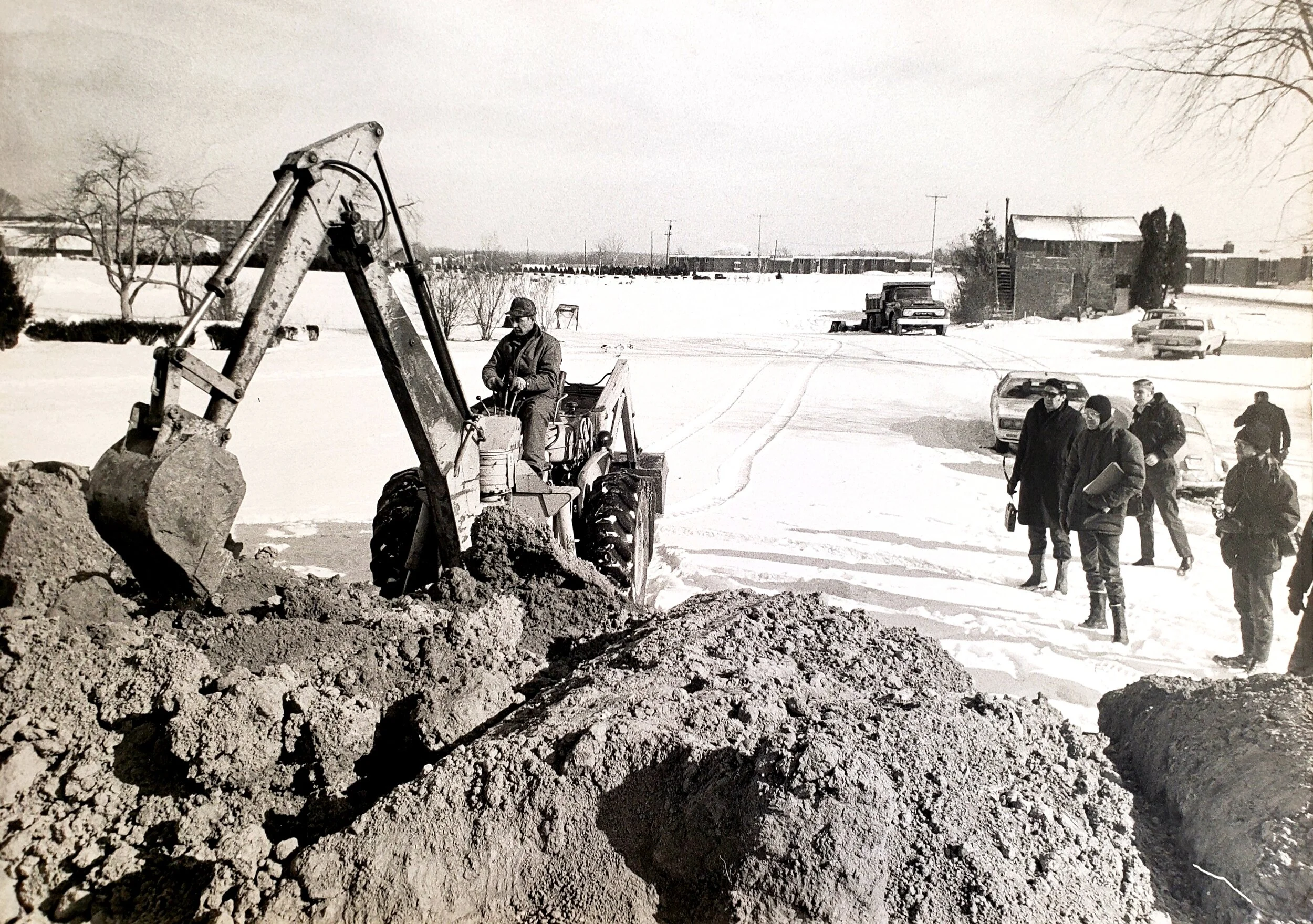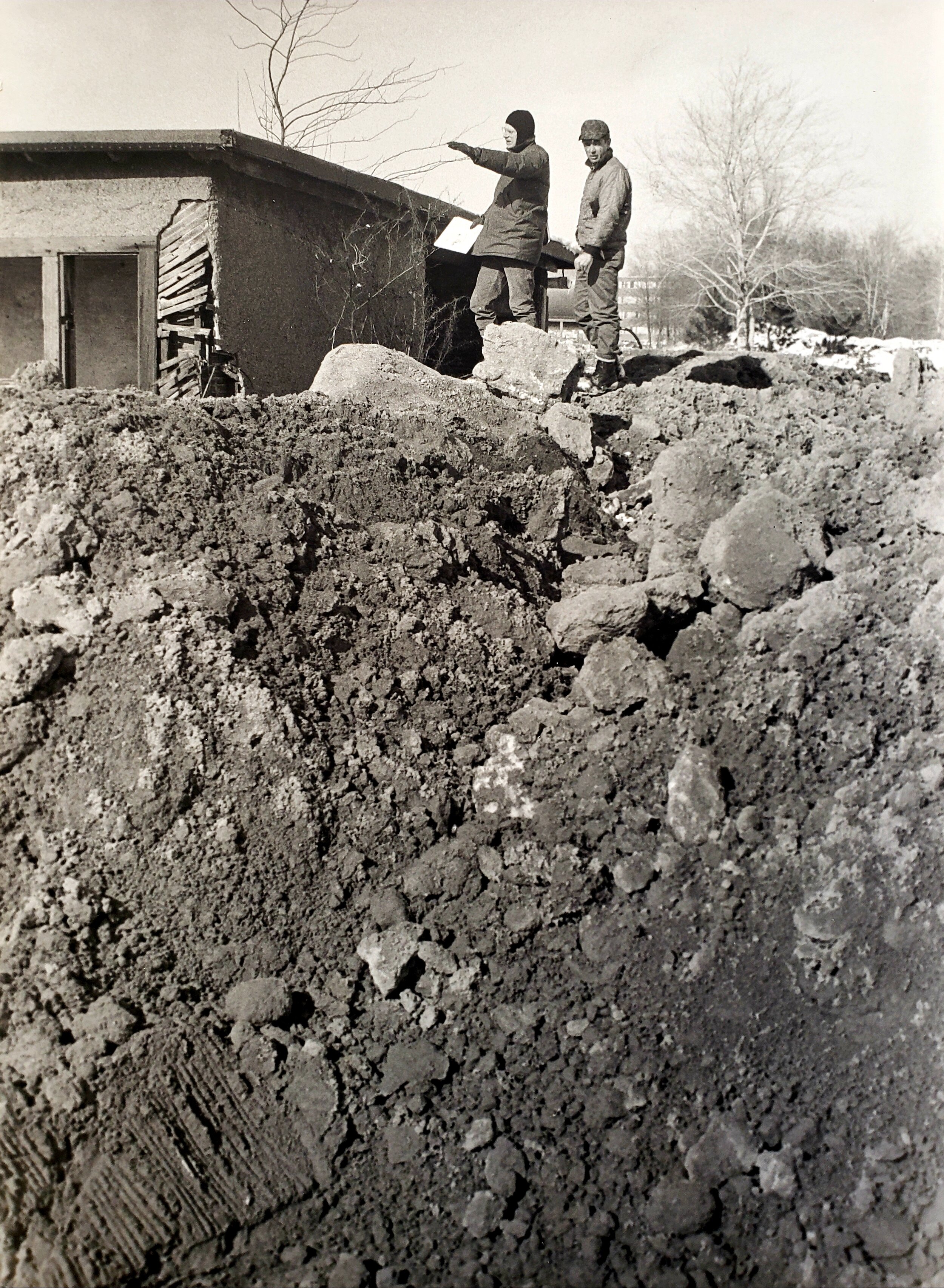 After frigid January temperatures barred him from completing his intended mud pour, Smithson, shown in this photograph on the right in a dark stocking cap, holding a notebook, realized another project he’d been considering: to bury a building, and let the process of entropy transform the structure over time.